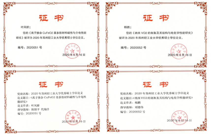 根据《郑州轻工业大学优秀硕士论文评选办法》,经研究生本人申请、学院评审、研究生处审核和公示,NBA中文网 叶凤娇、杨鹏两位研究生的硕士学位论文获“2020年度郑州轻工业大学优秀硕士学位论文”。