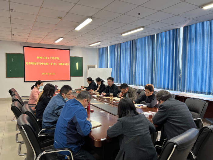 11月16日下午,物理与电子工程学院在四教楼510会议室召开了党委理论学习中心组(扩大)学习会议。学院中心组全体成员、各支部书记等参加学习。会议由学院党委书记赵阳主持。