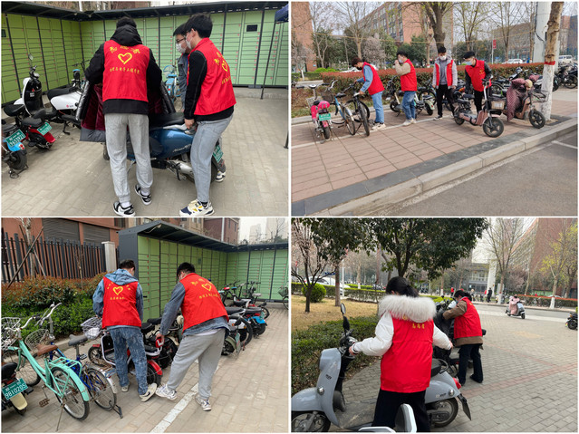 活动伊始,志愿者们按时到达集合地点,负责人对此次活动主要任务进行介绍,随后,志愿者们分成四组,分别来到教学楼、宿舍楼前,对停放的自行车、电动车位置重新进行整理摆放,部分同学因为个人疏忽或者赶时间将自己的自行车、电动车停随意放在校园的道路边,给师生通行造成了一定阻碍,也增加了车辆丢失、碰撞事故发生的可能性。通过志愿者们的共同努力,校园内车辆停放处变得整洁有序,为同学们的安全增加了保障,也传递了车辆文明停放的正能量。