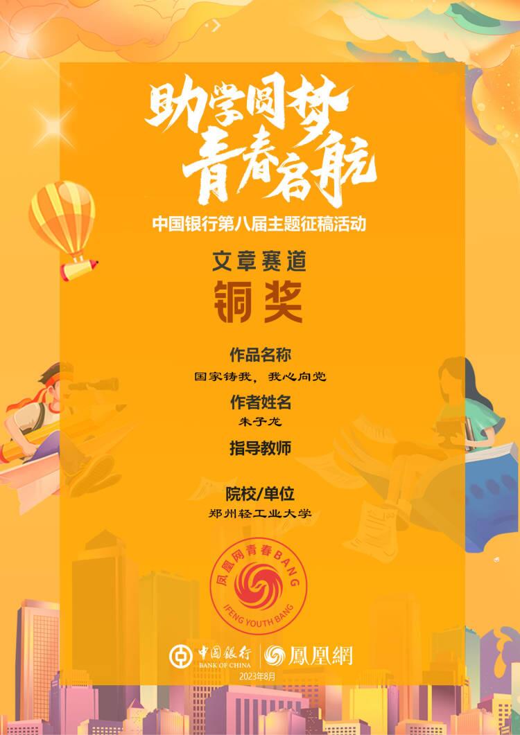 近日,由中国银行、凤凰网联合教育部全国学生资助管理中心共同举办的全国第八届“助学圆梦,青春启航”主题征稿活动落下帷幕。 经学校推荐、组委会评审、云展厅大众票选以及由中国银行、凤凰网、高校教师组成的权威评审团评选,我院学生朱子龙的作品《国家铸我,我心向党》获得铜奖。 近年来,学院高度重视资助育人工作,通过定期开展资助政策“两节课”宣传、励志教育、诚信教育、感恩教育等活动,进一步营造资助育人氛围,有效丰富育人形式,为促进学生全面成长护航助力。