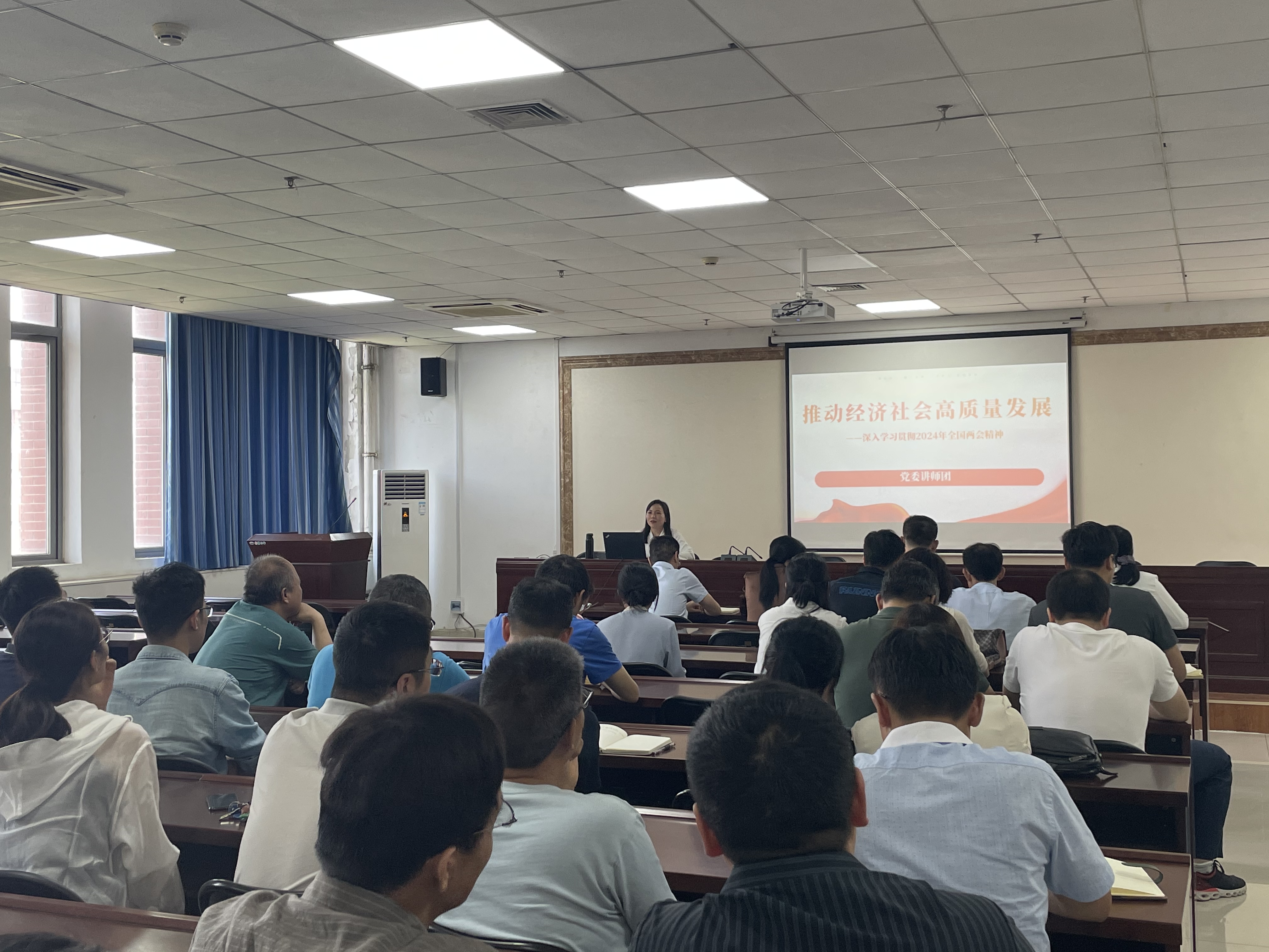 会上,郭静博士以《推动经济社会高质量发展——深入学习贯彻2024年全国两会精神》为题,对习近平总书记在全国两会上的重要讲话精神和政府工作报告做了详细的解读,重点阐释了“新质生产力”的内涵与发展、重要意义以及如何发展新质生产力。发展新质生产力是推动高质量发展的内在要求和重要着力点,是推动生产力迭代升级、实现现代化的必然选择,在学习与实践过程中要勇于创新,推动新质生产力加快发展。同时,郭静博士介绍了学校第五次党代会的召开情况,带领大家系统深入地学习了第五次党代会工作报告。