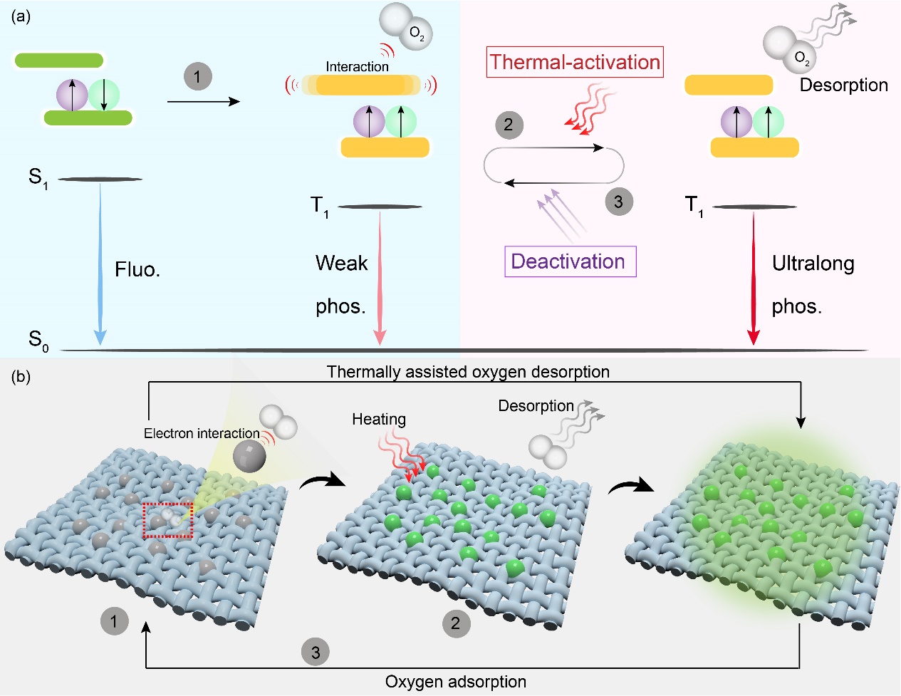 高温下有效工作的室温磷光(RTP)材料的开发仍然是一个挑战,因为三重态激子的热猝灭。高温导致发射损耗主要是由于激发电子的非辐射弛豫引起的,这显著阻碍了RTP材料的效率和运行稳定性。这种热猝灭过程涉及通过声子相互作用的热失活,然后通过非辐射弛豫释放它们。迄今为止,由于在高温下增加的非辐射弛豫引起的热猝灭过程,实现RTP材料中的热增强磷光仍然很罕见。热引起的非辐射弛豫是不可避免的,但是可以通过调节温度来调整磷光材料的周围环境。因此,通过将RTP材料纳入特定基质中,可以获得热增强的磷光材料。
