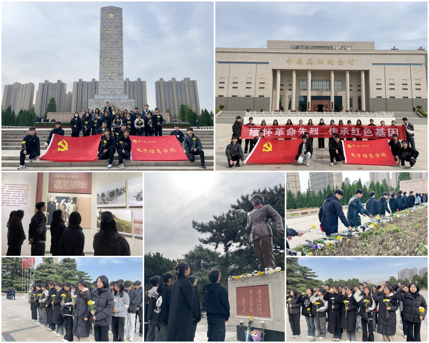 同学们怀着对革命英烈崇敬的心情,走入革命烈士纪念碑广场,面对庄严肃穆的烈士纪念碑,同学们集合肃立,默哀并鞠躬,表达对革命先烈的崇高敬意和深切悼念之情。随后,学生代表李雨杭带领同学们回顾了革命先烈们为理想信念舍生忘死、抛头颅洒热血的英勇事迹,每一个故事都深深触动着在场同学的心弦。随后,同学们在他的带领下举起右手面对党旗、团旗重温入党、入团誓词,铿锵有力的誓言是他们对革命先烈的承诺。迈着沉重的步伐,全体同学手捧鲜花,缓步走到纪念碑前,轻轻献上寄托着无尽缅怀的花束,向为国捐躯的英烈致以崇高的敬意。祭扫仪式结束后,同学们来到中原英烈纪念馆继续参观学习。馆内陈列的一幅幅珍贵历史照片和一件件历经沧桑的文物都生动再现了革命先烈为实现民族独立和人民解放,前赴后继、浴血奋战的伟大精神与坚定信念,让同学们深刻领悟到红色历史的厚重,也更加坚定了传承红色基因的决心。