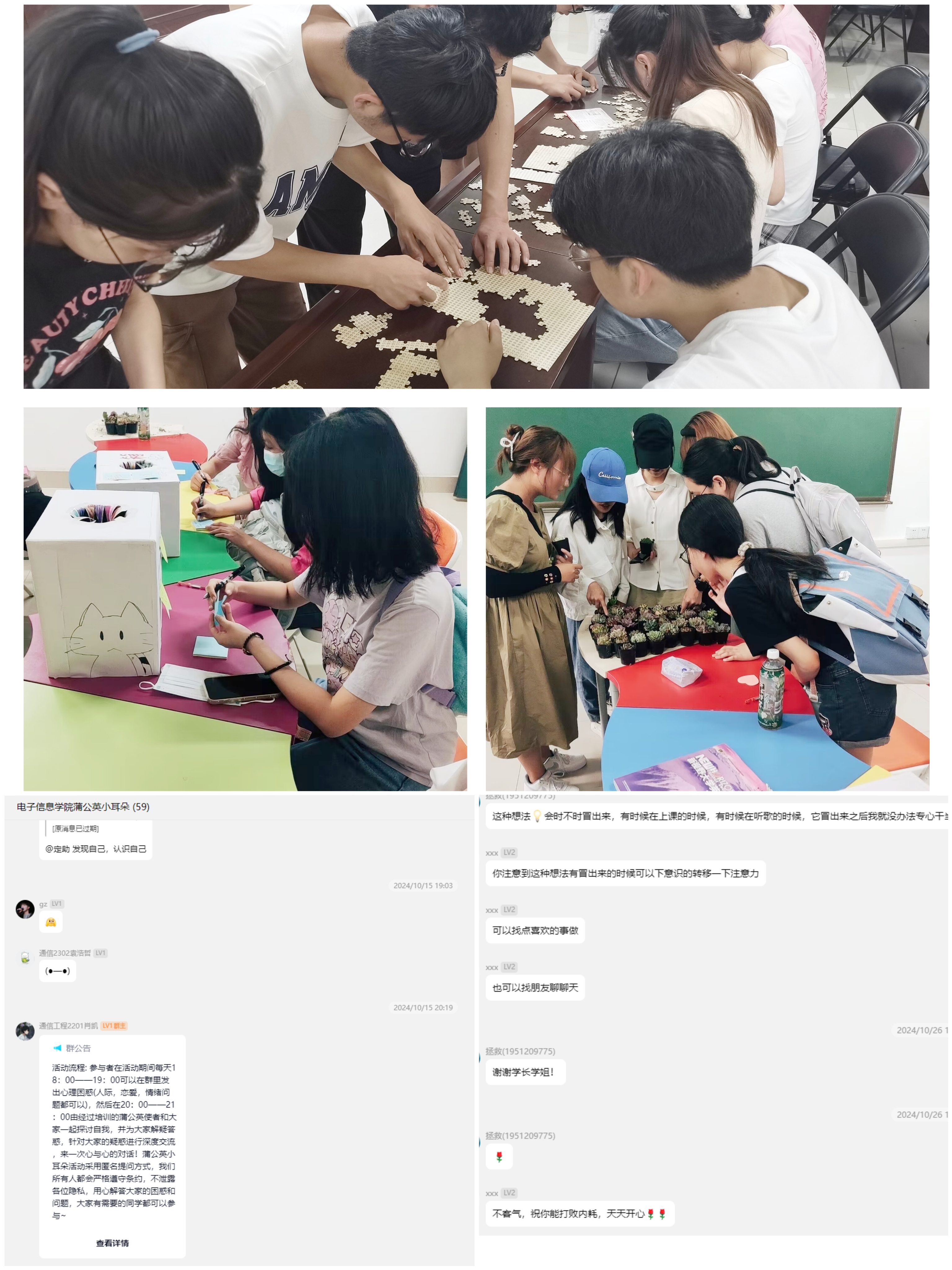 “心灵树洞”采用“线上+线下”双轨设计。线下,学院在心理工作室设置实体信箱,每周定期开放投递,针对收集的问题,策划主题讨论会。线上,心理骨干建立“蒲公英小耳朵”QQ群,采用匿名提问、共同回答的方式组织一次心与心的对话。所有群成员都要严格遵守条约,不泄露隐私,用心解答同学们的困惑和问题。参与者在活动期间每天18:00——19:00可以在群里发出心理困惑(人际、恋爱、情绪等问题),在20:00——21:00由经过培训的蒲公英使者为同学们答疑解惑,共同探讨自我。