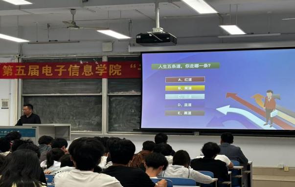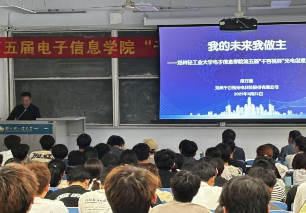 段万通总经理为电子科学与技术2024级学生做了“我的未来我做主”的报告。报告主要从创业经历、公司发展、创业感悟三个方面介绍了自己学生时代的创业过程、收获、体会及郑州千百视光电科技股份有限公司创业历程、主营业务、产品安装展示视频等,跟学生分享了创业感悟和大学生的职业规划,着重指出当代大学生应该做喜欢做的、擅长做的、有意义的事情,过上有尊严的人生。
