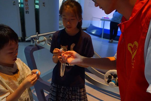 互动实验环节里,实践队员们带来的“小道具”格外吸睛。手中的卡通钥匙扣,被赋予科学讲解使命 —— 从材料特性谈到创意设计,让小朋友明白“生活处处有科学”。当小朋友拿到钥匙扣,触摸、观察、提问,科学知识便在这小小的互动里,悄然种进童心。
