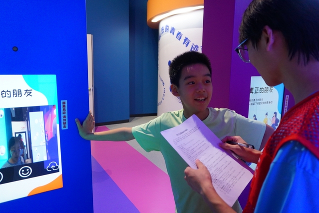 在科技馆内,实践队员们化身“科普引路人”,与参观的青少年开启一场场奇妙的科学对话。在“真正的朋友”主题展区,队员拿着问卷与小朋友交流,引导他们思考友谊与成长的关联,将科学精神与人文关怀巧妙融合。而在蓝色展板前,小朋友专注研读“青少年心理健康调研”问卷,队员在旁轻声讲解、引导思考,把科普从知识传递延伸到心理关怀,让科学探索更具温度。