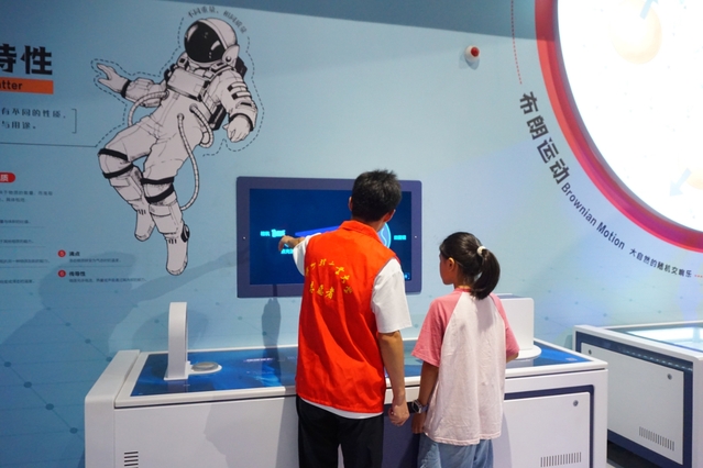 科技馆的展品成为实践队员们开展科普的“生动教材”。在布朗运动、物质特性等展区,队员指着墙上的宇航员、运动轨迹示意图,结合展品操作,为小朋友讲解微观世界的奥秘,面对航空航天主题展品,实践队员从宇航员服装特性讲到太空探索意义,把遥远的太空知识讲给小朋友们。