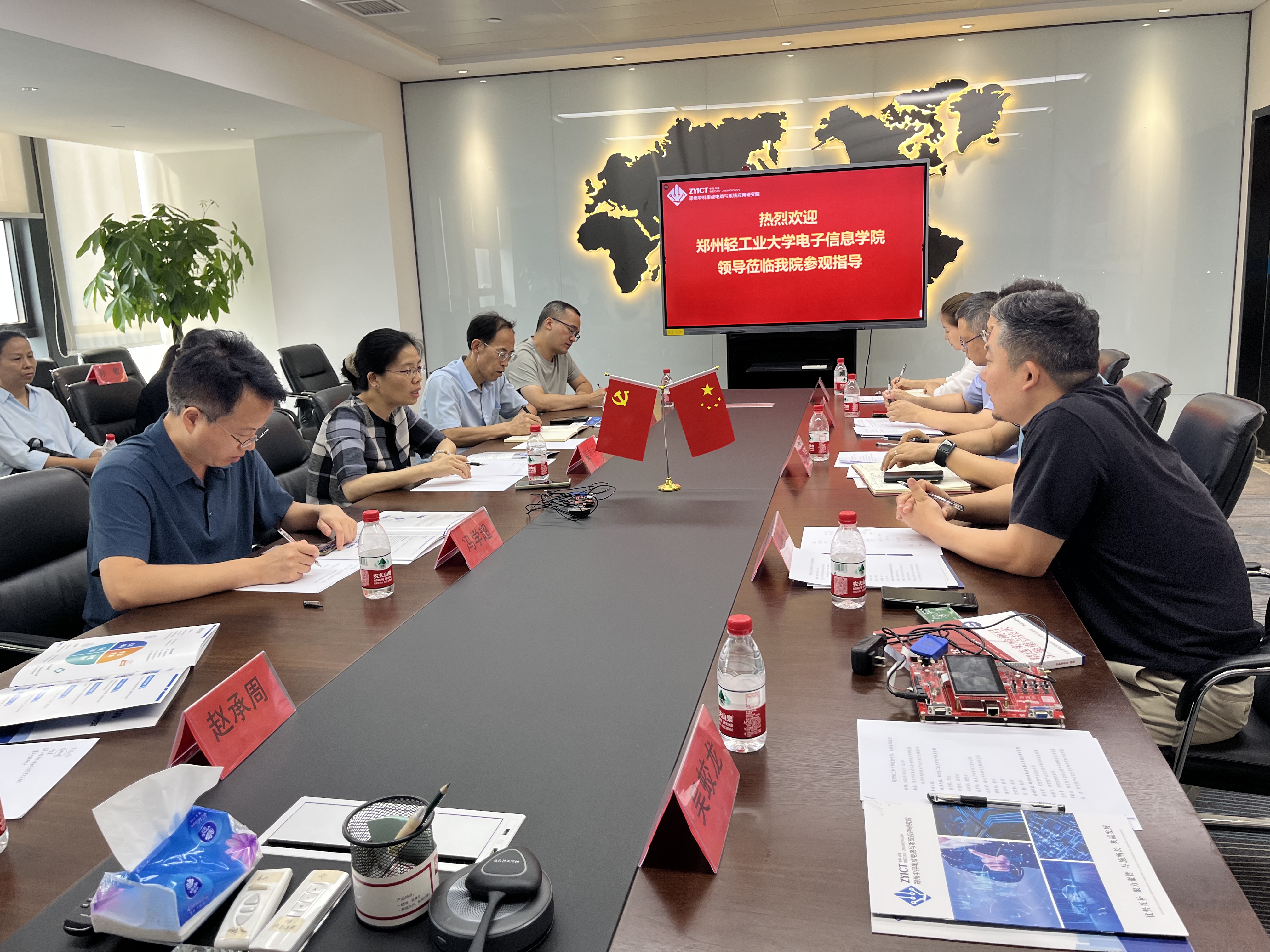 郑州中科集成电路与系统应用研究院产业化处梁志军处长对姜利英一行的到来表示热烈欢迎。交流会上,姜利英院长介绍了学院的发展历程、师资队伍、科研平台和专业设置等基本情况,梁志军处长介绍了实验室、研发中心、产品应用、企业技术实力和合作需求。随后,双方就校企科研项目合作、人才培养、专业建设、学生就业等内容进行了深入交流,明确了下一步具体合作事宜。