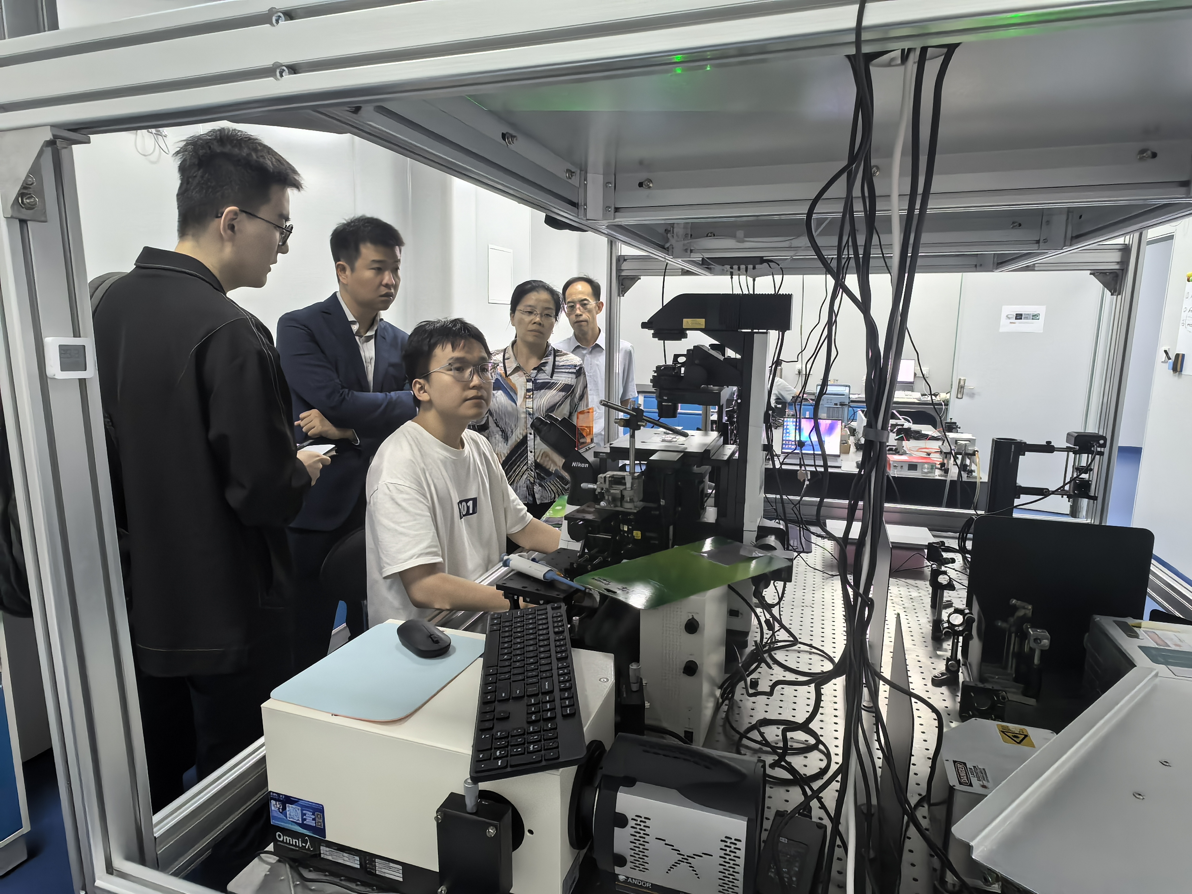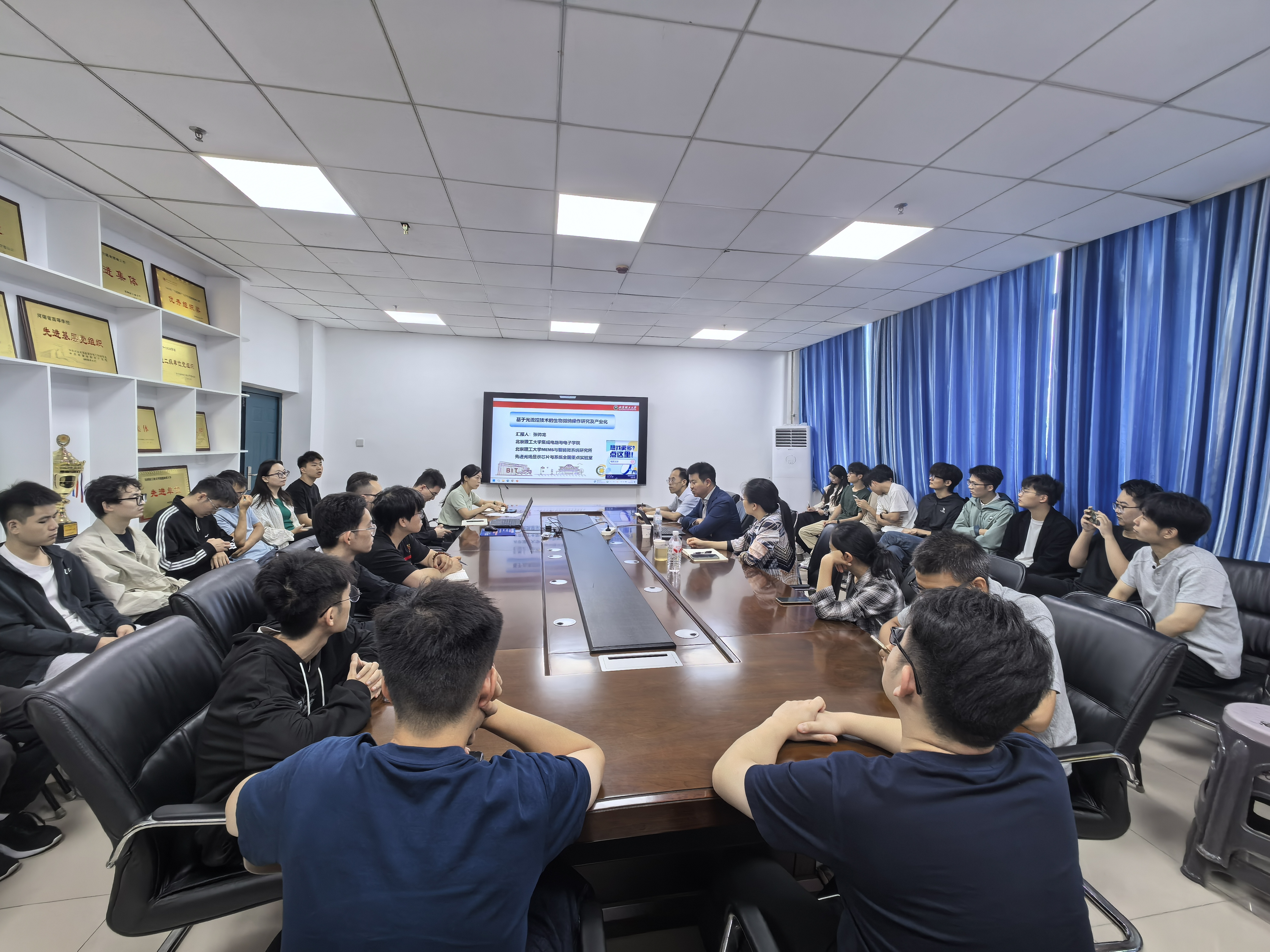 张帅龙教授首先讲解了光电镊技术的原理、特点及光诱导效应在绝缘体、半导体、生物细胞等方面的纳米尺度操控,并详细介绍了基于光电镊技术的国产仪器设备开发与应用。然后介绍了数字微流控技术在TFT薄膜晶体管、光谱仪、质谱仪、核磁共振、片上单细胞精准控制与筛选等方面的应用及产业化。随后,张教授对参会教师及研究生提出的问题进行了详细解答。会后,张教授参观了量子科技研究院实验室,并对下一步具体合作事宜进行了深入研讨。