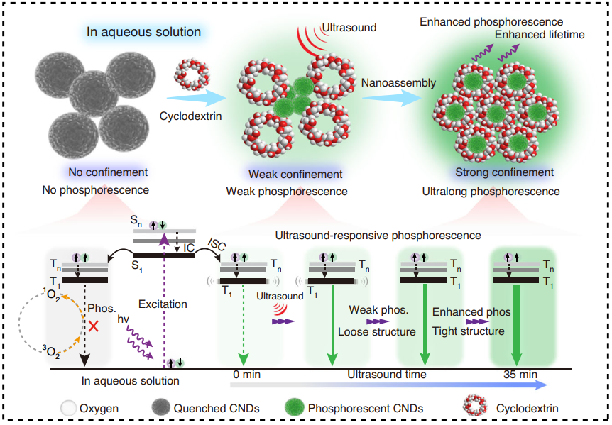 具有刺激响应特性的固态磷光材料已广泛应用于多个领域。然而,由于三重态激子的超快失活特性以及对水环境的敏感限制了其进一步应用,如何在水溶液中精准调控碳点的三重态激子刺激位点,实现长寿命水溶磷光仍面临挑战。本研究提出一种微尺度刚性框架工程策略,巧妙地利用了环糊精的特性,通过超声刺激水溶液中环糊精自组装,成功增强了碳纳米点(CNDs)的刚性来激活三重态激子,从而调控其磷光特性。实验成功制备出在水溶液中寿命达1.25秒的超声响应型磷光碳纳米点。该材料对周围超声波具有高灵敏度,在调控过程中对超声波呈现线性响应。这种超声响应型磷光碳纳米点展现出作为超声雷达检测和体内余辉成像传感单元的巨大应用价值。