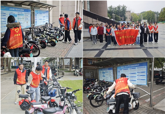 活动伊始,志愿者们按时到达集合地点,负责人对此次活动主要任务进行介绍,随后,志愿者们分成四组,分别来到图书馆、宿舍楼前,对停放的自行车、电动车位置重新进行整理摆放,部分同学因为个人疏忽或者赶时间将自己的自行车、电动车停随意放在校园的道路边,给师生通行造成了一定阻碍,也增加了车辆丢失、碰撞事故发生的可能性。通过志愿者们的共同努力,校园内车辆停放处变得整洁有序,为同学们的安全增加了保障,减少因车辆无序摆放导致的碰撞和矛盾,也传递了车辆文明停放的正能量。